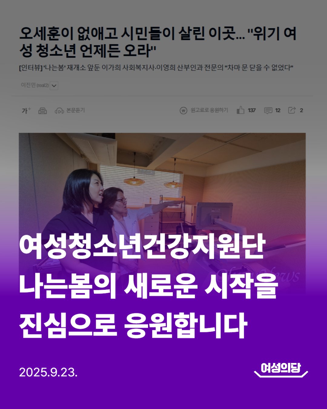 서울시가 일방적으로 폐쇄했던 서울시립십대여성건강센터 '나는봄'이 시민 118명의 후원으로 다시 문을 열었습니다. 위기에 처한 십대 여성들의 든든한 보금자리가 되어줄 '여성청소년건강지원단' 나는봄의 새로운 시작을 진심으로 응원합니다.