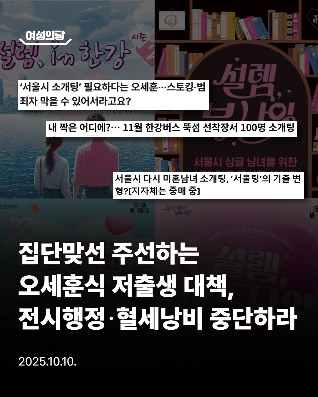 저출생 앞세워 미혼남녀 집단맞선 주선하는 오세훈 시장은 낡은 정치로 혈세 낭비 마십시오 | |