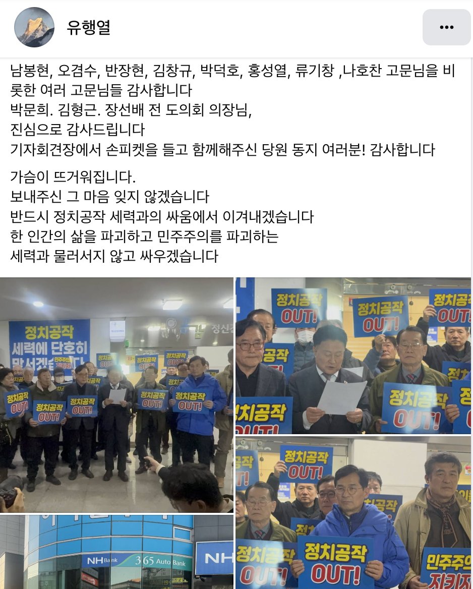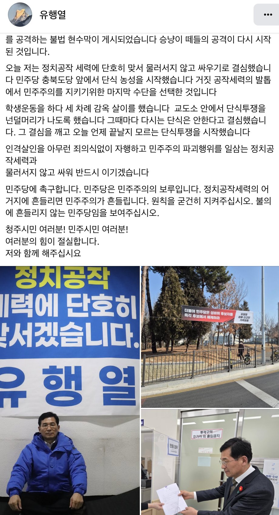 지금 이 순간에도 더불어민주당 충북도당 앞에서 '결백'을 운운하며 단식 농성까지 벌이고 있는 유행열에게 묻고 싶습니다. 본인은 정말 선거철마다 왜 같은 의혹이 제기되는지 모르십니까? 누군가의 정치공작 같아서 그토록 억울하십니까? 그 이유는 명백합니다. 본인이 탐욕스럽게 정치권 복귀를 시도하고 있기 때문입니다.