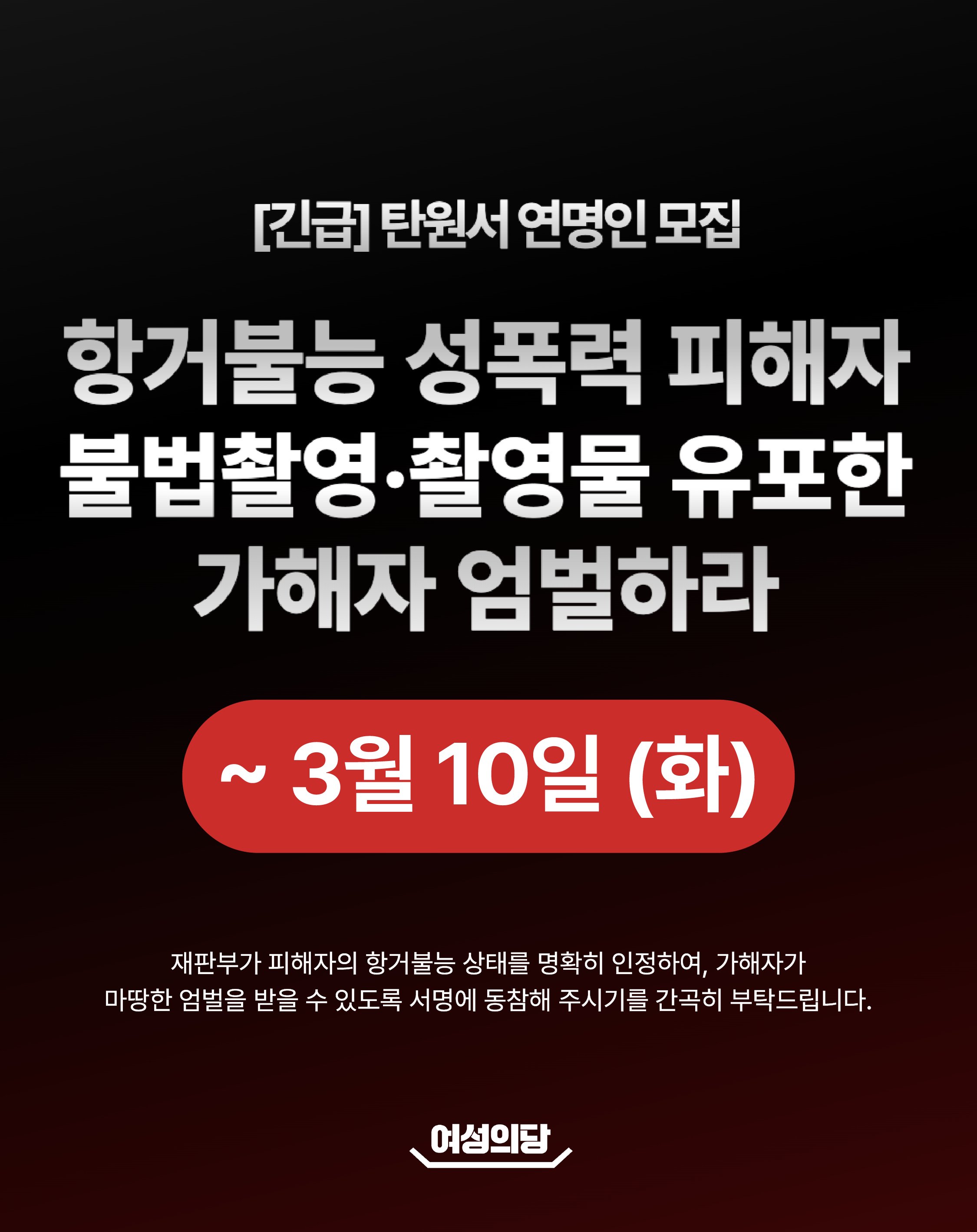 재판부가 피해자의 항거불능 상태를 명확히 인정하여 가해자가 마땅한 엄벌을 받고, 440건의 불법촬영물에 대한 정당한 재판이 다시 열릴 수 있도록 탄원서 서명에 동참해 주시기를 간곡히 부탁드립니다.